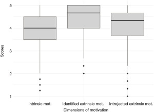 Results to the descriptive analyses of motivation levels in the study showed a mean score of 3.90 (SD =0.82) for intrinsic motivation; a mean of 4.38 points (SD =0.58) for identified extrinsic motivation; and a mean of 4.15 points (SD =0.74) for introjected extrinsic motivation (see Figure 3).
