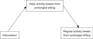 A behavioral proximal outcome that captures small steps towards sustainable behavior change (distal outcome) seems most appropriate (26). An adequate proximal outcome that is likely to mediate the effect on regular activity breaks from sitting is the number of active breaks from prolonged sitting over a day. Conceptually, when an older adult interrupts his/her sitting time throughout the day for a few weeks it is likely that breaks from sitting will soon become habitual. Figure 1 depicts the model.