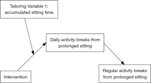 The distal outcome is the long-term goal of a JITAI (44). For the purpose of this paper, the distal outcome is regular interruptions of prolonged sitting with light physical activity. We chose this outcome for four reasons.