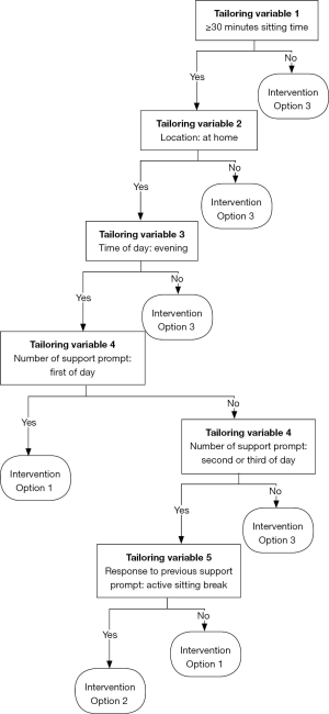 The decision points mark the moments in time when a decision about an intervention option is made based on the level of the tailoring variables (26,44). Hence, decision points are intrinsically linked to the tailoring variables. As highlighted above, the evening hours are the time period when older adults accumulate most of their sitting time, and when they are most likely to be able and willing to take sitting breaks (70,72). Consequently, the decisions points should be in the evening hours (potentially between 5 pm to 9 pm). Tailoring variables 1, 2, 4 and 5 will then determine when an intervention is triggered. Figure 3 depicts the complete conceptual JITAI and a full description of the components can be found in the Table S1.